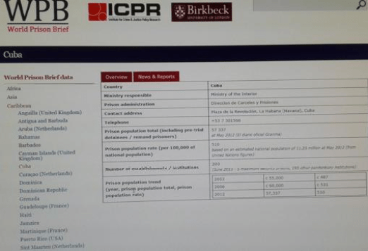 Según el documento, en la actualidad habría alrededor de 90.000 presos en las cárceles cubanas, lo que convertiría a Cuba en el país con mayor población reclusa del mundo, con 794 reclusos por cada 100.000 habitantes (el segundo lugar lo ocupa EE.UU.). Un dato que desmiente las cifras que el régimen cubano ofreció, a través del periódico «Granma», su órgano de propaganda, en 2012, cuando indicó que la población reclusa era de 57.336, lo que rebajaba a 510 el número de presos por cada 100.000 (y situaba a Cuba en el sexto puesto a escala mundial). Estos datos son los únicos que estaban todavía vigentes, a falta de una actualización oficial, según la información publicada por el Institute for Criminal Policy Research (ICPR) en su página web, donde se mantienen los de 2012.