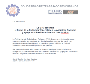 La Solidaridad de Trabajadores Cubanos (STC) denuncia el vil atropello a que fueron sometidos la mayoría de los diputados a la Asamblea Nacional y su presidente interino Juan Guaidó, al impedir su acceso al Palacio Federal Legislativo para ser reelecto por un nuevo período.